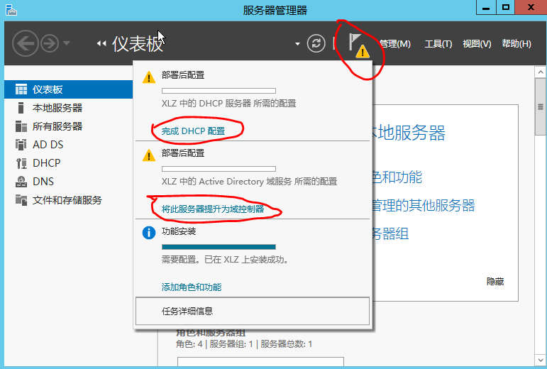 3.添加安装功能角色(AD+DNS+DHCP) 安装后点击黄色叹号先将此服务器提升为域控服务器