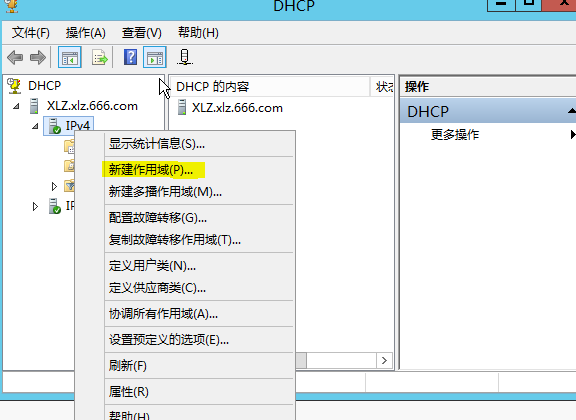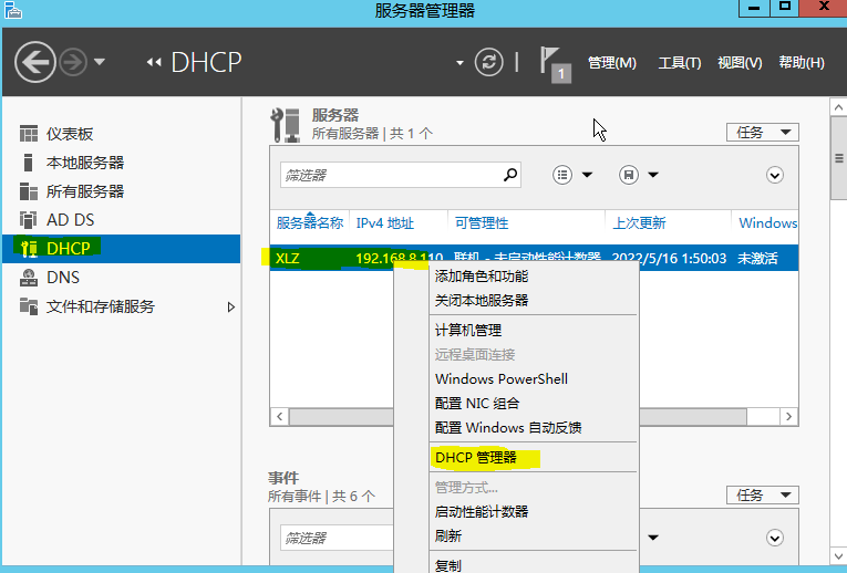 4.接着点击刚刚的黄色叹号配置DHCP服务,提交关闭后右击DHCP服务器名称选择DHCP管理