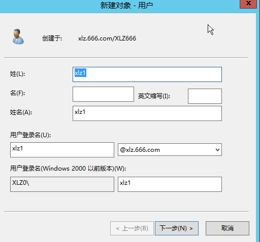 在XLZ666的组织单位文件夹中新建两个用户,用户xlz1并把它设为管理员,用户xlz2默认为普通用户
