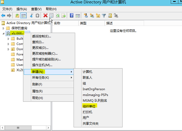在xlz.666.com域里面新建一个组织单位,名称为XLZ666
