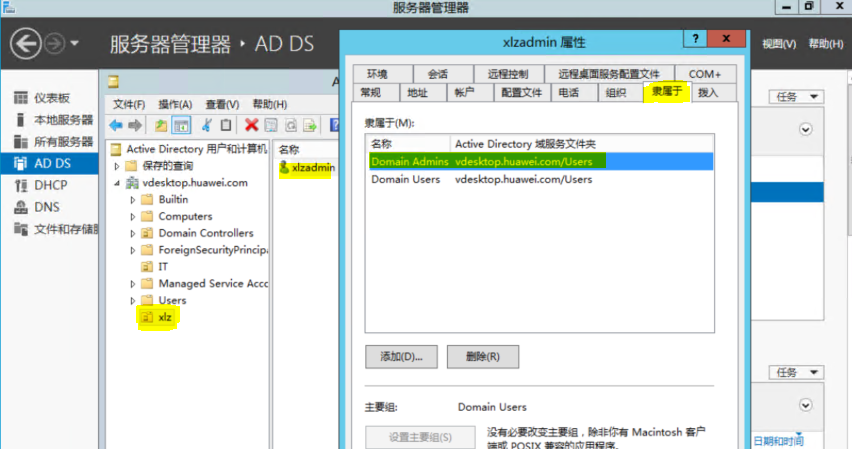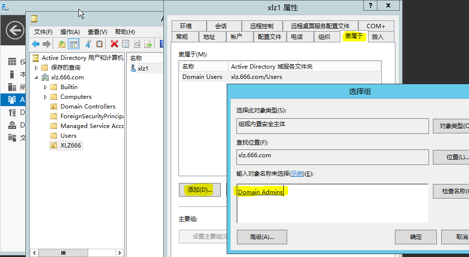 默认新创建的用户隶属于domain users(普通用户),右击用户xlz1属性,隶属于,添加为domain admins(域控管理员)