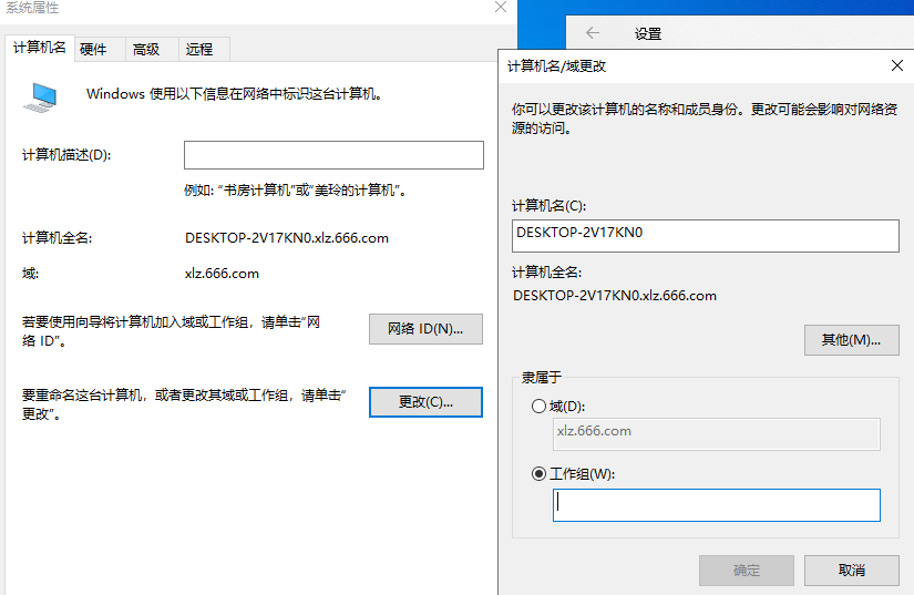然后我们使用xlz1管理员账户登录看看能否做更改计算机名这些操作,如下图,显然是可以的,也可以退出该域,从此不受该域的束缚