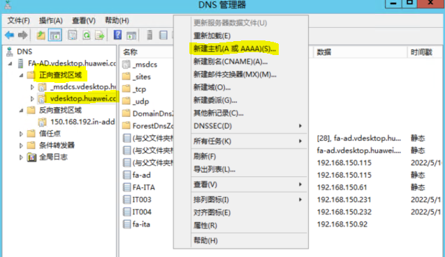在DNS管理器中的正向查找域中找到对应的ad域,在右边空白的地方右键新建主机