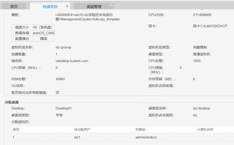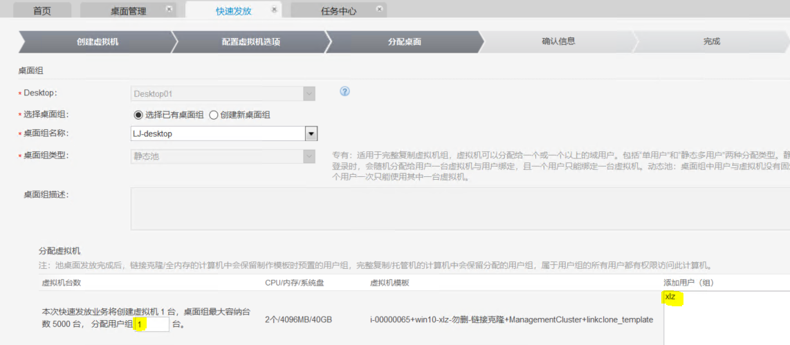 发放一台完整复制虚拟机,并分配登录该虚拟机云桌面的用户为xlz1