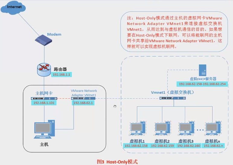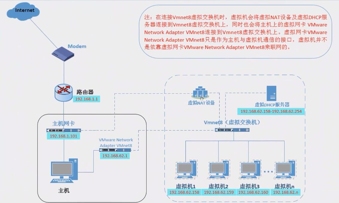 由虚拟DHCP服务器或手动分配好固定的IP地址,如要访问外网直接通过虚拟NAT设备把虚拟机固定的私有IP转换为宿主机的公有地址去访问即可。