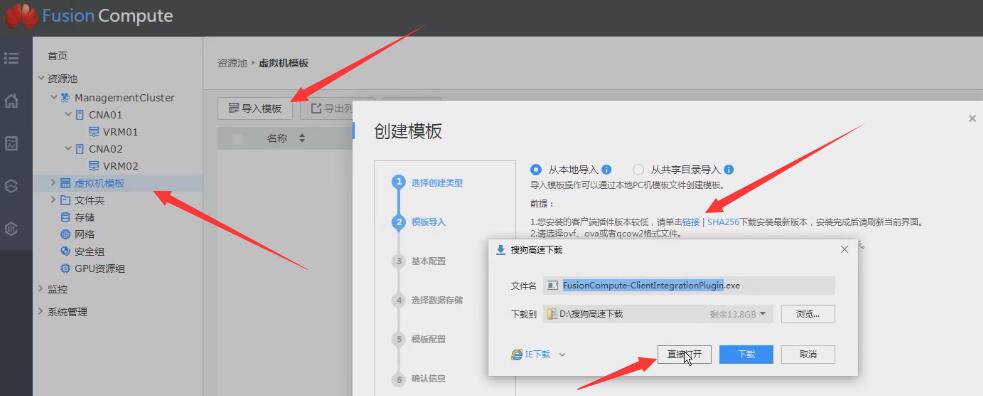 在FC中点击 虚拟机模板>导入模板>如果提示插件过低则点击>链接>下载安装插件