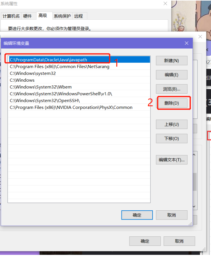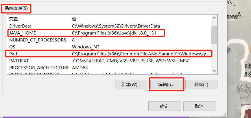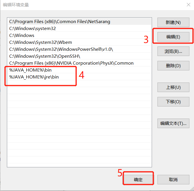 (4)系统变量区域范围,找到PATH系统变量,点击编辑,删除上方的变量,新建两个变量如下,配置完成后保存即可。