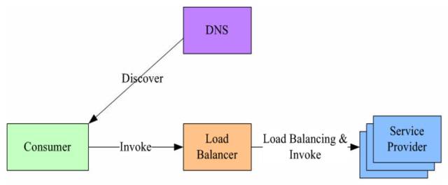 在服务消费者和服务提供者之间有一个独立的LB,通常是专门的硬件设备如 F5,或者基于软件如 LVS,HAproxy等实现