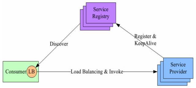 服务提供方启动时,首先将服务地址注册到服务注册表,同时定期报心跳到服务注册表以表明服务的存活状态,相当于健康检查,服务消费方要访问某个服务时,它通过内置的LB组件向服务注册表查询(同时缓存并定期刷新)目标服务地址列表,然后以某种负载均衡策略选择一个目标服务地址,最后向目标服务发起请求
