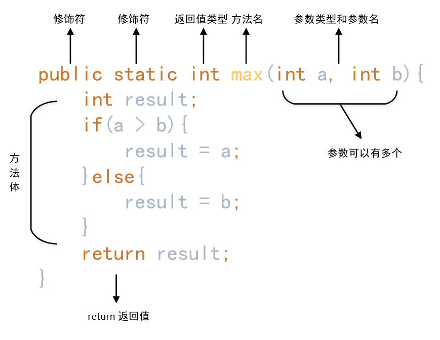 修饰符 返回值类型 方法名(参数类型 参数名){ …… 方法体 …… return 返回值; }
