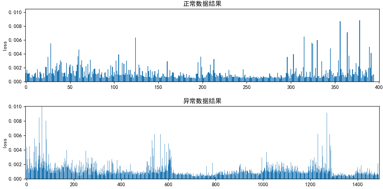 如上所述,可以看到a图的loss相当小,只能放大成b图,而b图的正常数据和异常数据的loss差距很模糊,不明显。