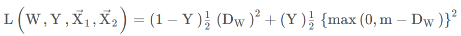 Dw是数据对特征的欧式距离;Y用于表示是否同类,同类表示为0, 不同类表示为1;m是一个阈值。