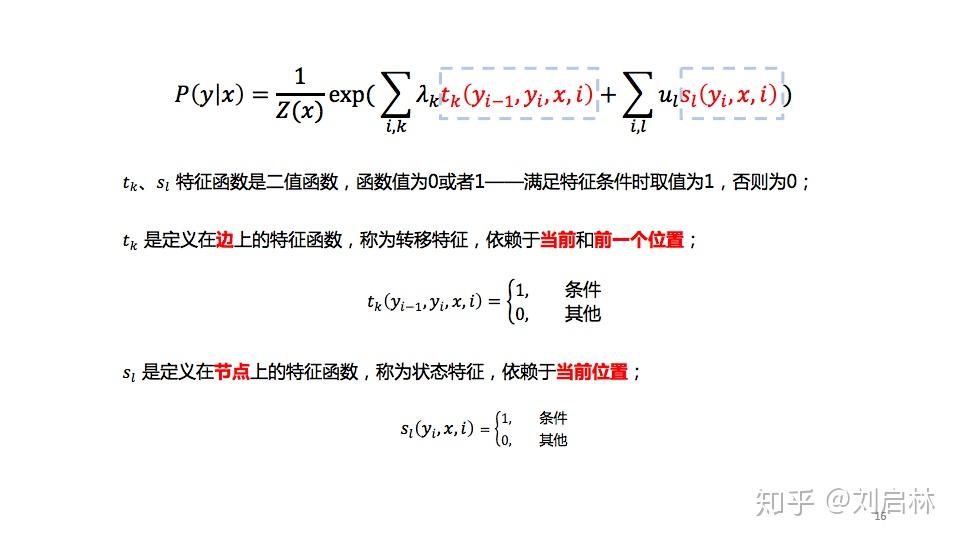 转移特征函数指定义在边上的特征函数,依赖当前和前一个位置;状态函数是定义在节点上的特征函数,依赖于当前位置。