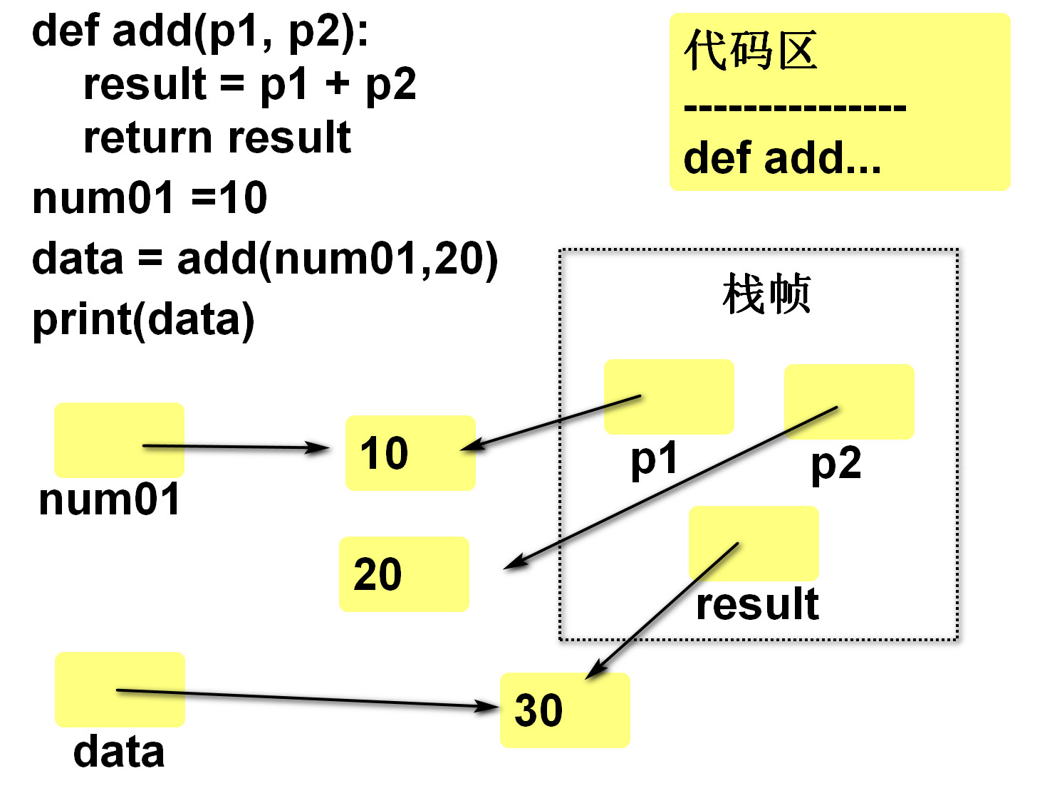 调用函数add,传入参数num01和20,则参数p1存储10的地址值,p2存储20的地址值