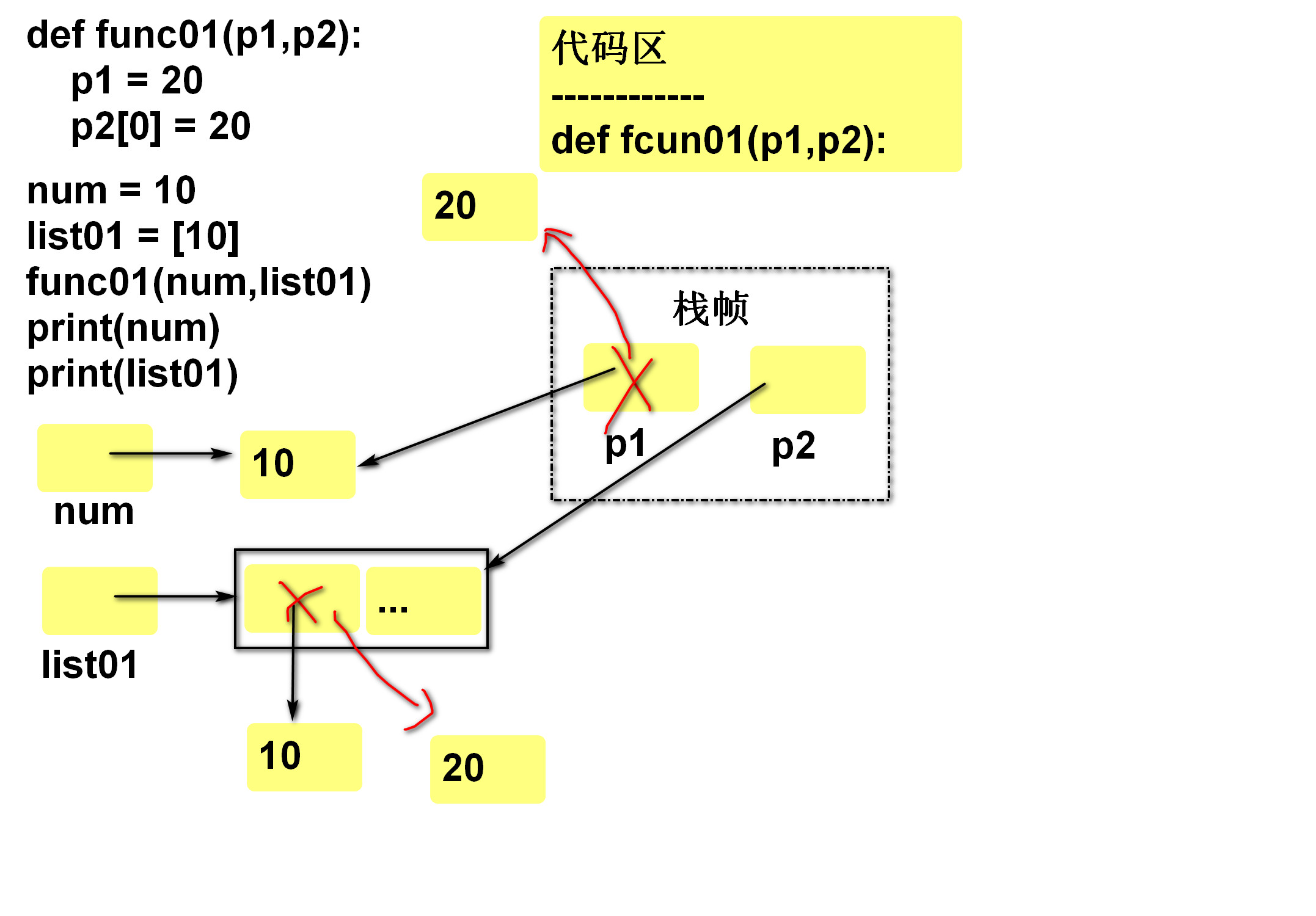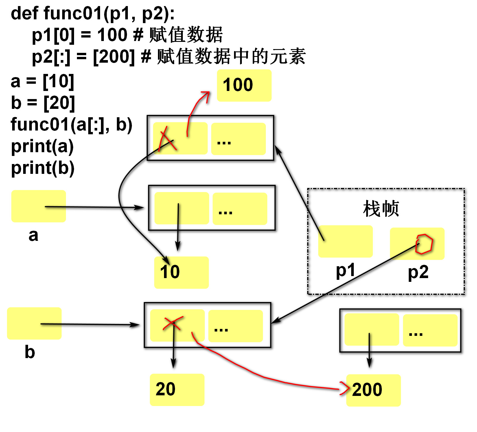 运行函数func01传入a[:]和b,则p1存储的是新列表[10](为原先列表复制)的地址值,p2存储的是列表[20]的地址值