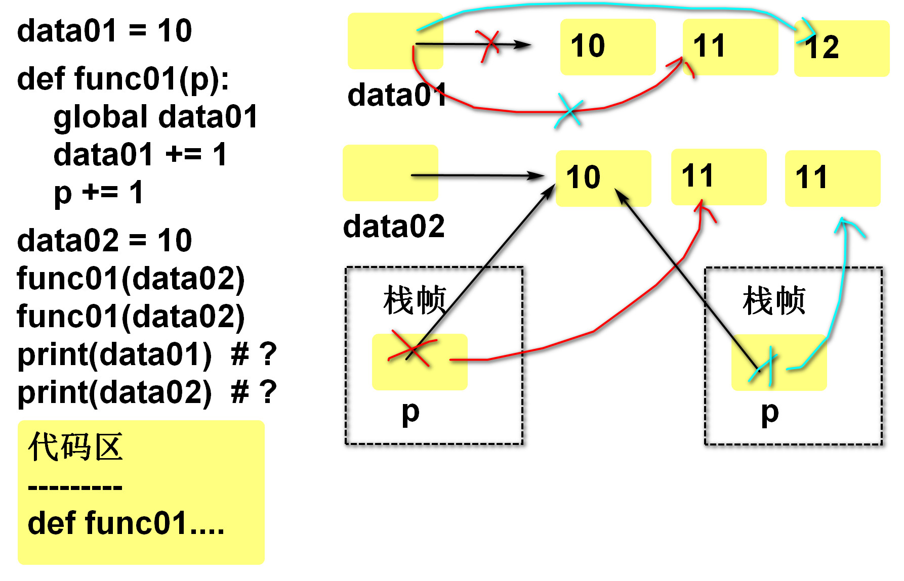 使用关键字global标记函数内的data01为全局变量,则data01 += 1,全局变量data01存储的是12的地址值,p += 1存储的是11的地址值