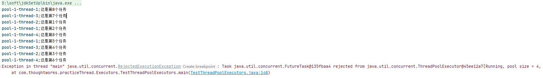 ThreadPoolExecutor executor = new ThreadPoolExecutor(2, 4, 2, TimeUnit.SECONDS, new LinkedBlockingDeque<>(5)); executor.setRejectedExecutionHandler(new ThreadPoolExecutor.AbortPolicy()); for (int i = 0; i < 10; i++) { int count = i; FutureTask futureTask = (FutureTask<Integer>) executor.submit(new Callable<Integer>(){ @Override public Integer call(){ System.out.println(Thread.currentThread().getName()+";这是第"+count+"个任务"); return 3; } }); }