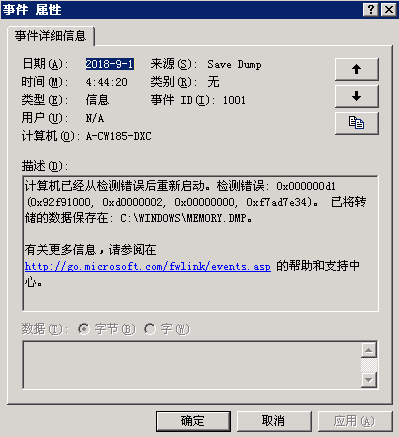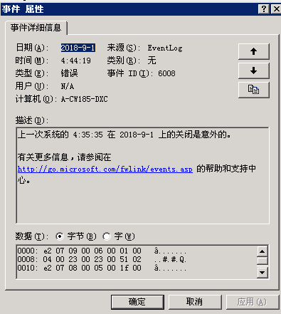 查看操作系统日志方法:控制面板-管理工具-事件查看器-系统,查看重启时间前后的事件,一般查看以下事件:1076、1074、6013、6008、1001。查到以下相关日志: