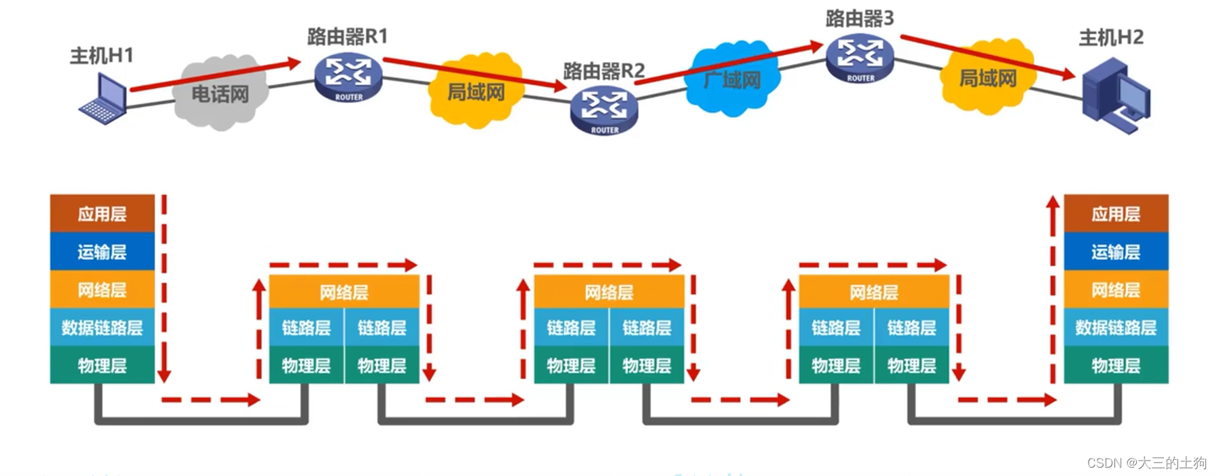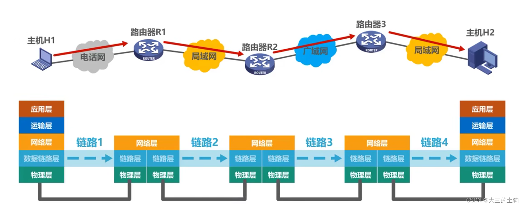 - 数据链路(data link) 除了物理线路外,还必须有通信协议来控制这些数据的传输。若把实现这些协议的硬件和软件加到链路上,就构成了数据链路。