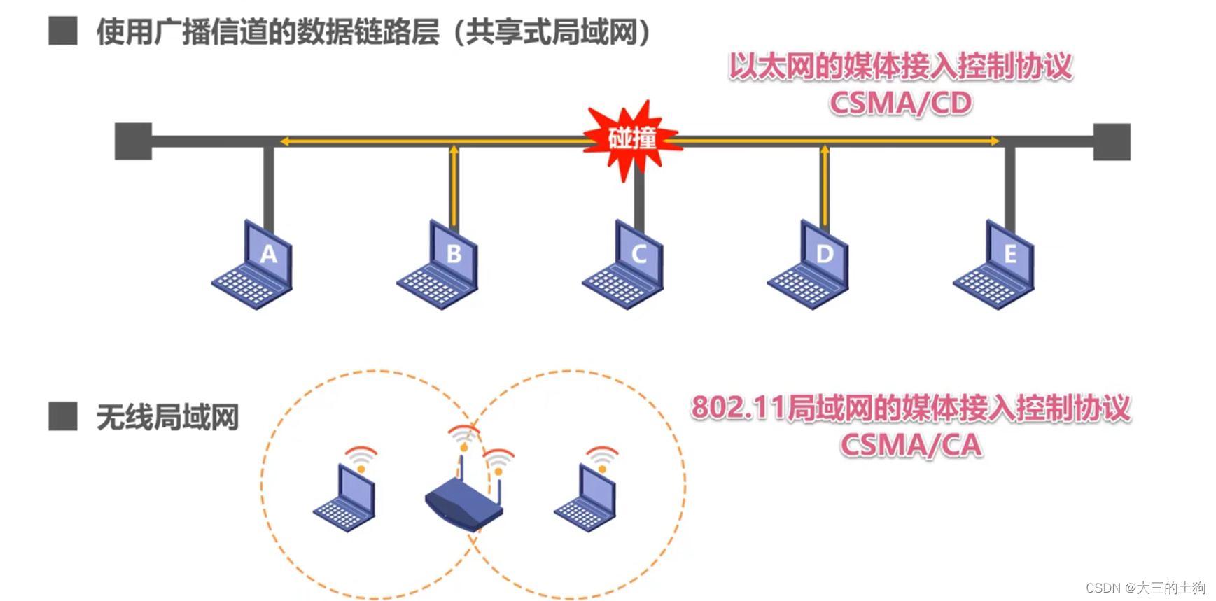 - 多点接入 :说明这是总线型网络,许多主机以多点的方式连接到总线上。