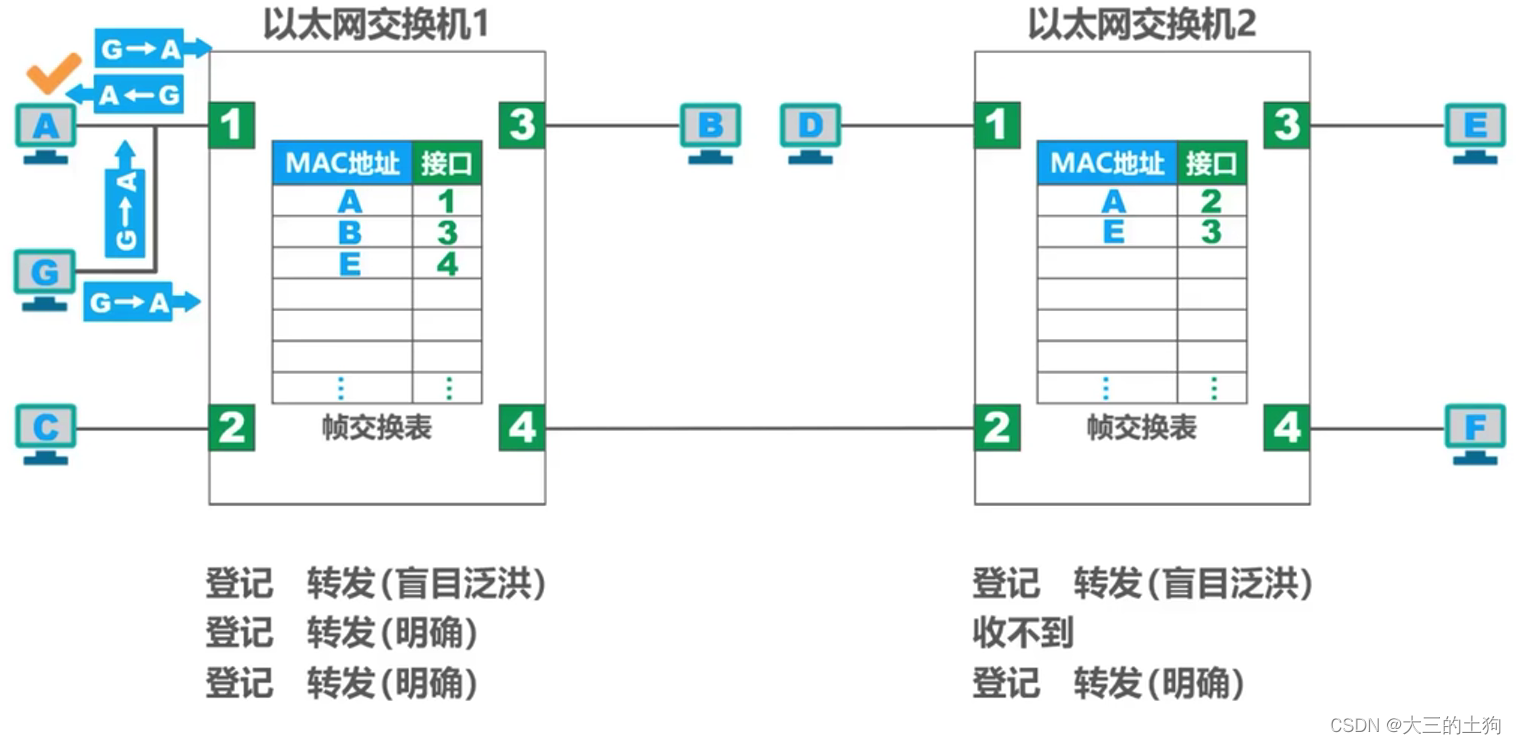 - 交换机具有自学习能力,学习的是交换表的内容,交换表中存储着 MAC 地址到接口的映射。