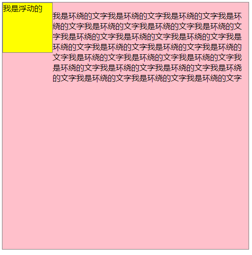 1 <style> 2 .left { 3 float: left; 4 height: 100px; 5 width: 300px; 6 background-color: yellow; 7 border: 1px solid grey; 8 } 9 10 .father { 11 height: 500px; 12 width: 500px; 13 background-color: pink; 14 border: 1px solid grey; 15 } 16 17 </style> 18 19 <body> 20 <div class="father"> 21 <div class="left">我是浮动的</div> 22 <p> 23 我是环绕的文字我是环绕的文字我是环绕的文字我是环绕的文字我是环绕的文字我是环绕的文字我是环绕的文字我是环绕的文字我是环绕的文字我是环绕的文字我是环绕的文字我是环绕的文字我是环绕的文字我是环绕的文字我是环绕的文字我是环绕的文字我是环绕的文字我是环绕的文字我是环绕的文字我是环绕的文字我是环绕的文字我是环绕的文字我是环绕的文字我是环绕的文字 24 </p> 25 26 </div> 27 </body>