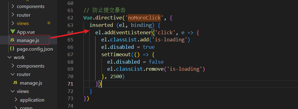 在入口文件中添加noMoreClick指令,当按钮需要防暴击时加上v-noMoreClick即可,如下所示