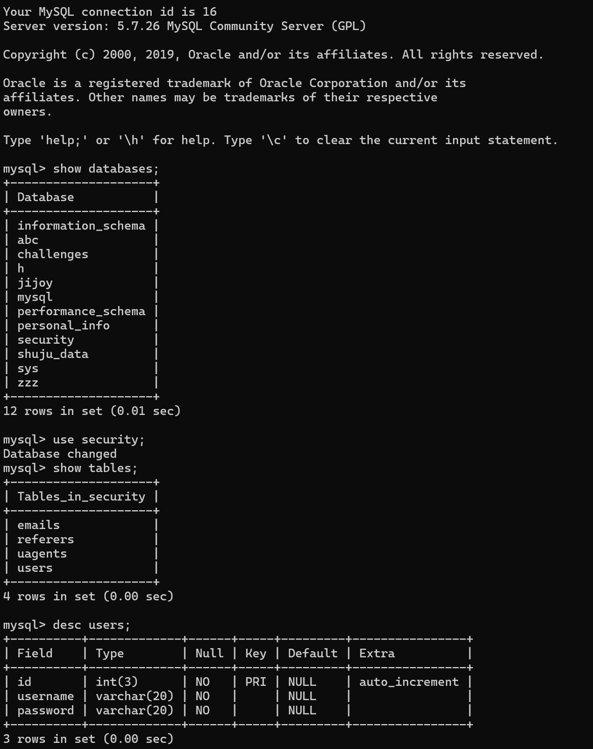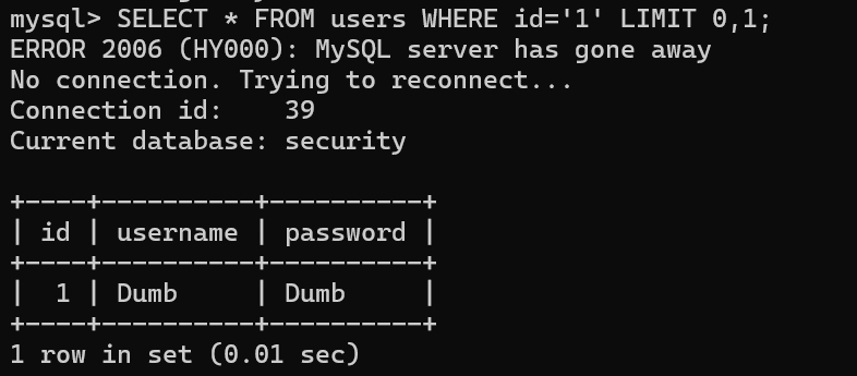 SELECT * FROM users WHERE id='1' LIMIT 0,1;
