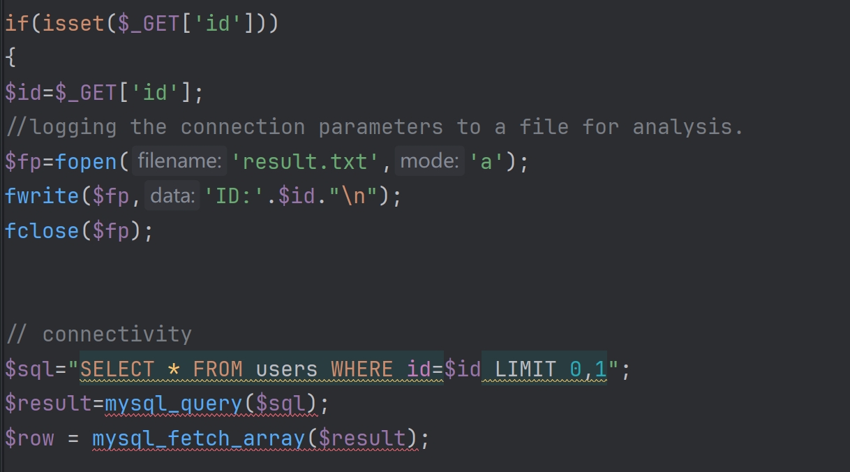 $sql="SELECT * FROM users WHERE id='-1' or 1=1--+' LIMIT 0,1";