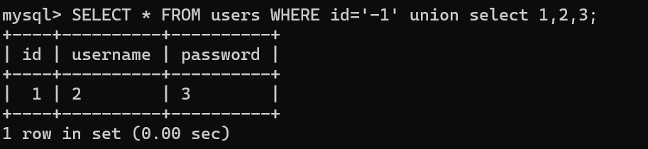 就是将两个查询语句通过union连接在一起 因为id=-1不存在 所以会输出1,2,3