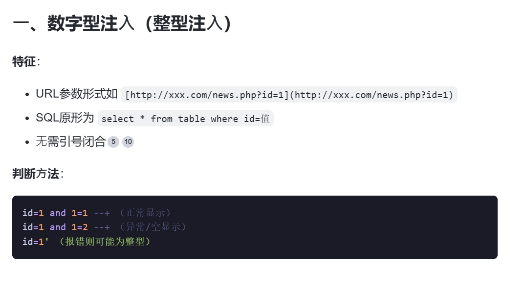 注入点参数为数字类型(如id=1),无需引号闭合。
