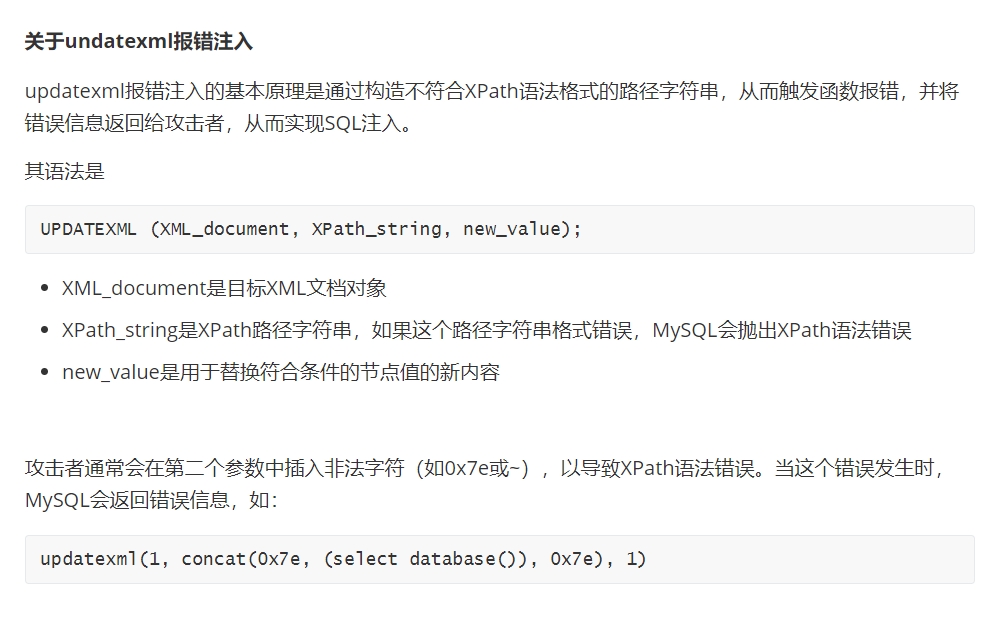- updatexml()函数:用于更新XML文档中的特定路径内容。