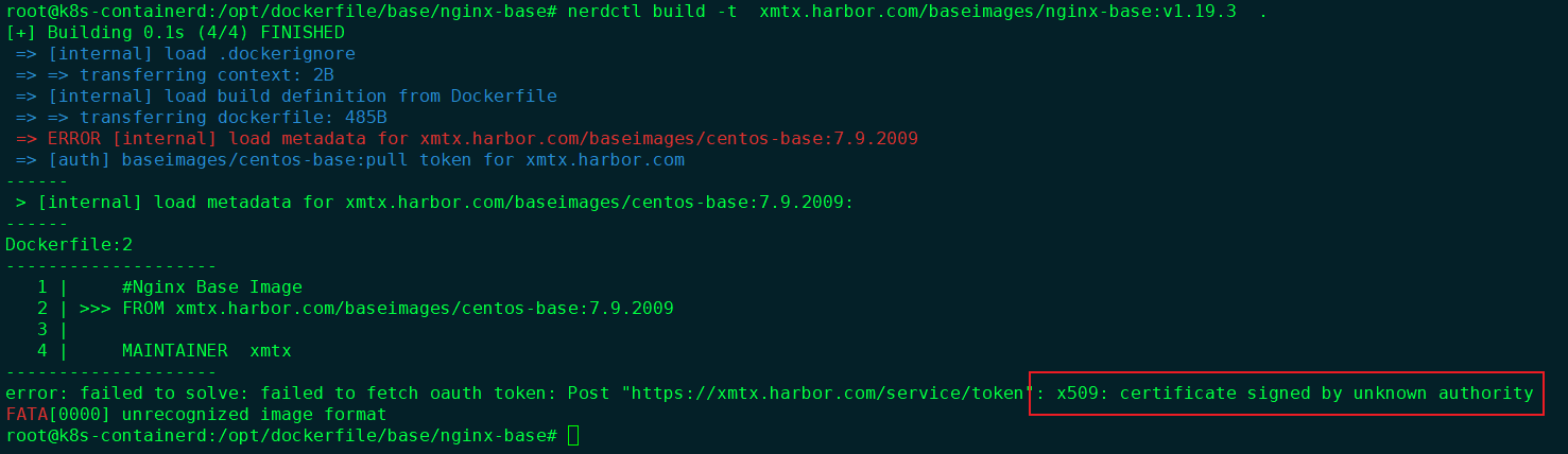 如果harbor使用的是自签发的https认证,则构建镜像时会出现证书认证错误: