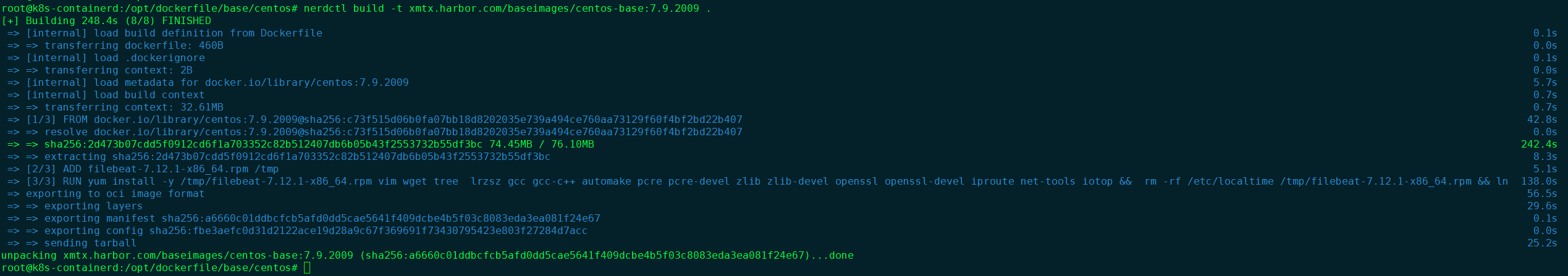 root@k8s-containerd:/opt/dockerfile/base/centos# nerdctl build -t xmtx.harbor.com/baseimages/centos-base:7.9.2009 .
