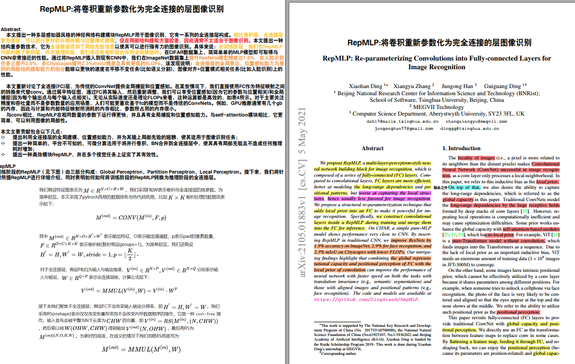 Title: RepMLP: Re-parameterizing Convolutions into Fully-connected Layers for Image Recognition Participants: Xiaohan Ding ,Xiangyu Zhang ,Jungong Han,Guiguang Ding |