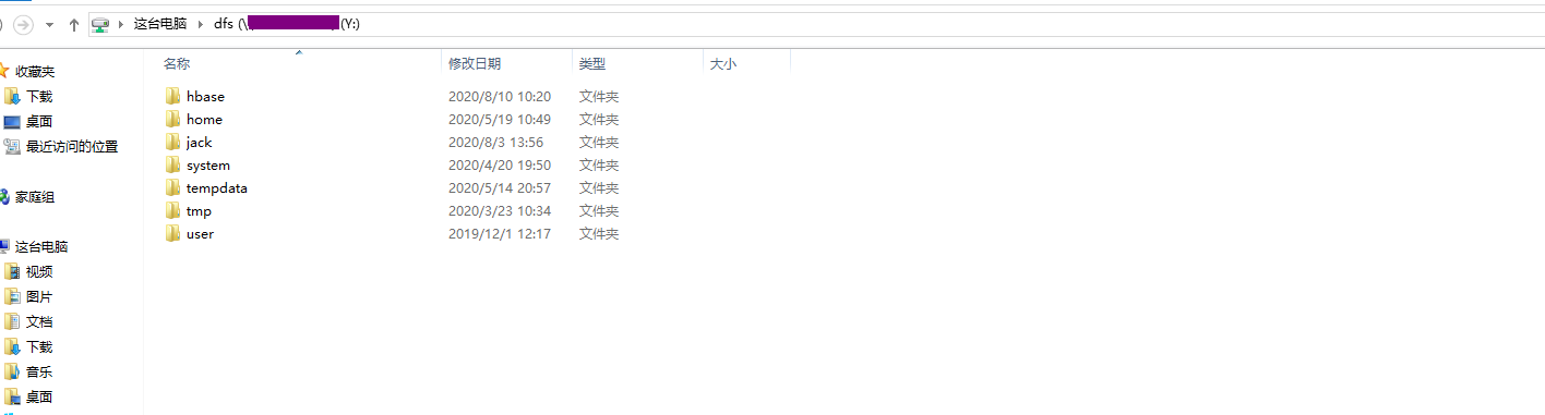 通过以上简单两步即可以将hdfs挂载到/home/dfs下并以samba匿名共享方式让windows系统免客户端操作hdfs