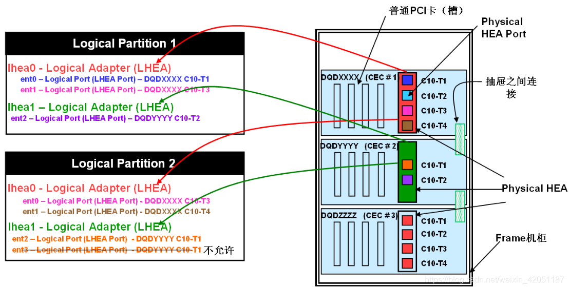 - 每个HEA卡在分区上都对应一个唯一的LHEA(如果分配了此HEA卡端口给这个分区),而即使将一个HEA卡的两个端口都分配给这个分区,也只能有唯一一个LHEA设备。当然如果分别将多个HEA卡的端口分给此分区,则可以看到多个LHEA设备。例如<图 274 HEA、LHEA、AIX设备关系>中,Logical Partition 2分区lhea1是不可能的情况,即将一个物理端口(C10-T1)映射两次,生成两个逻辑端口。但是Logical Partition 1分区lhea0分配了两个物理端口(C10-T1/T3),映射出两个ent设备,这是可能的情况;