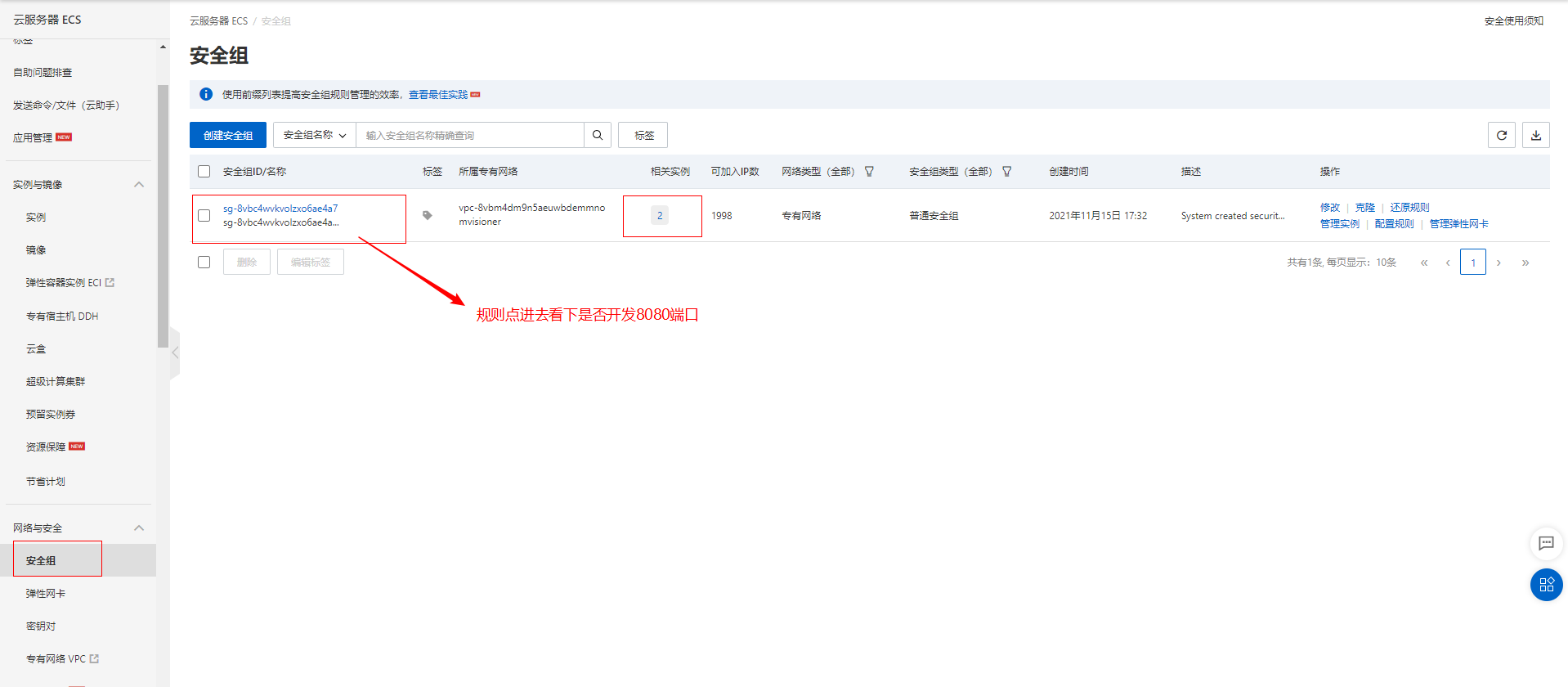 发现无法联通,则需要先去阿里元ESC的安全组中看下这台服务器的安全组策略是否开放了8080端口,发现安全组里面没有开放8080端口,现在加上这个规则