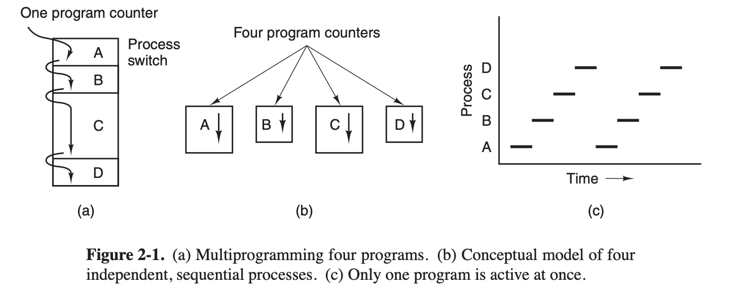 如下图所示,每个进程都有自己的程序,彼此独立运行,然而实际上只有一个CPU,只有一个物理的程序计数器,所以当进程运行的时候,进程的逻辑程序计数器被加载到实际的程序计数器,运行时间结束的时候,就会把物理程序计数器保存到逻辑程序计数器。所以看上去程序都在并行运行,但是在任意时间,都只有一个进程在运行