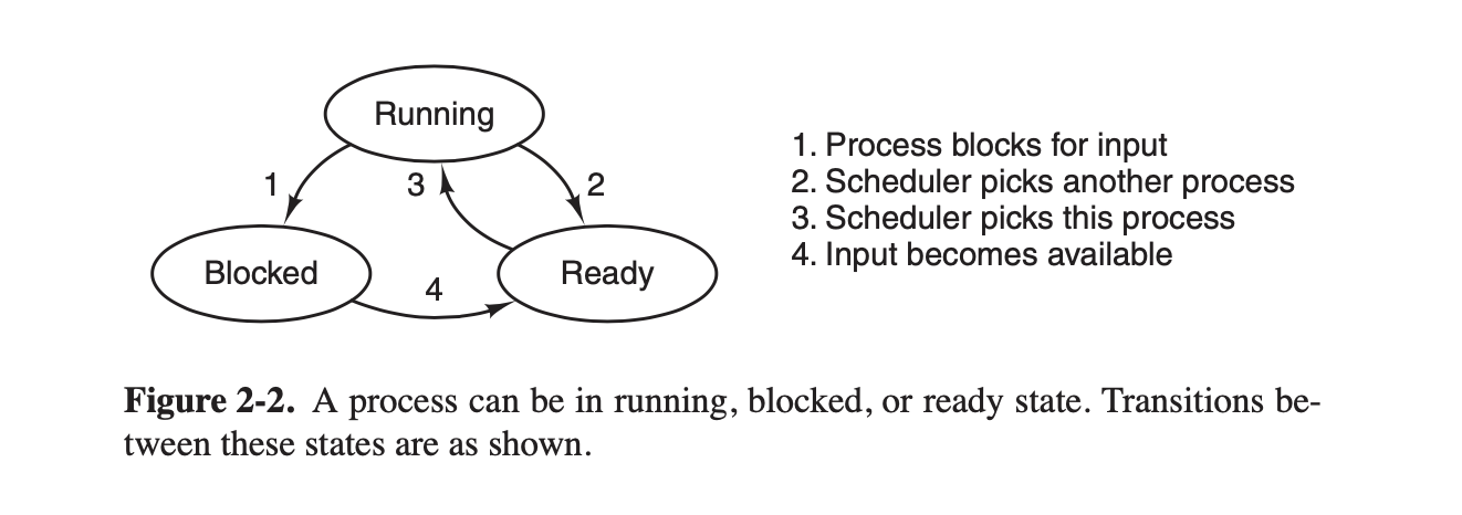 进程主要是通过进程表(process table)结构体实现整个进程,也有称为进程控制块(process control blocks,即PCB)。主要的数据有:程序计数器,栈计数器,内存分配,打开文件的状态,还有一些上下文切换所必须要的数据