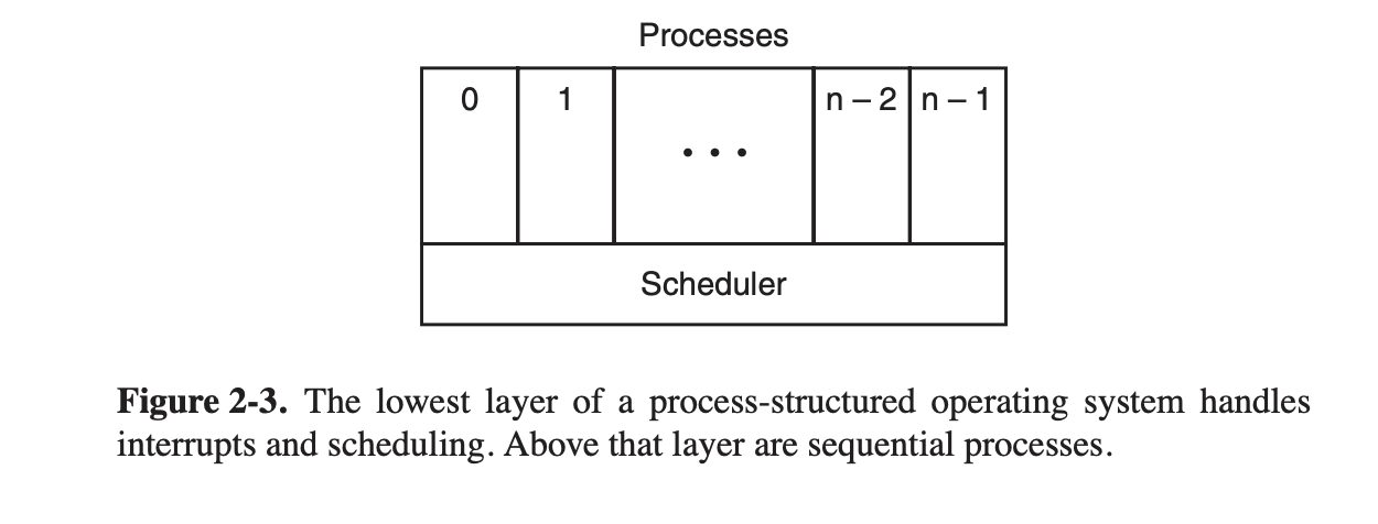 所以进程模型总结来说就是下面这个图。操作系统底层是调度器,上层是各种进程,调度器实现了一些隐藏的细节比如上下文切换,进程数据保存和恢复等
