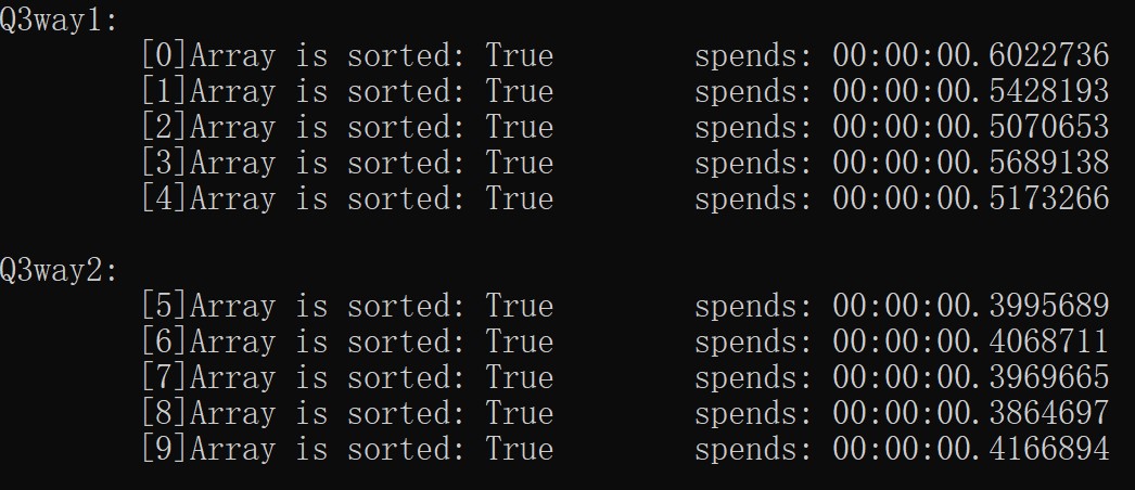 static void Main(string[] args) { SortTest2(); } /// <summary> /// 批量分组测试两种算法 /// </summary> public static void SortTest2() { int scale = 1000000; // 构造10个随机数组并赋值 SortTest[] sortTests = new SortTest[10]; for (int i = 0; i < 10; i++) { sortTests[i] = new SortTest(scale, 1, 1000); } // 构造10个计时器 Stopwatch[] sw = new Stopwatch[10]; for (int i = 0; i < 10; i++) { sw[i] = new Stopwatch(); } // 前5个用来测试第一个算法,后5个测试第二个 Console.WriteLine("Q3way1: "); for (int i = 0; i < 5; i++) { sw[i].Start(); QuickSort.Quick3way1(sortTests[i].Arr); // 实现1 sw[i].Stop(); Console.Write($"\t[{i}]Array is sorted: " + sortTests[i].IsSorted()); Console.WriteLine("\tspends: " + sw[i].Elapsed); } Console.WriteLine("\nQ3way2: "); for (int i = 5; i < 10; i++) { sw[i].Start(); QuickSort.Quick3way2(sortTests[i].Arr); // 实现2 sw[i].Stop(); Console.Write($"\t[{i}]Array is sorted: " + sortTests[i].IsSorted()); Console.WriteLine("\tspends: " + sw[i].Elapsed); } } /// <summary> /// 生成随机整数组成的IComparable数组 /// </summary> /// <param name="a"></param> /// <param name="scale"></param> /// <param name="minValue"></param> /// <param name="maxValue"></param> public static void GetRandomArray(IComparable[] a, int scale, int minValue, int maxValue) { if (a.Length < scale) return; // 用系统时间作为随机种子 Random rd = new Random(unchecked((int)DateTime.Now.Ticks)); for (int i = 0; i < scale; i++) { a[i] = rd.Next(minValue, maxValue); } } /// <summary> /// 检验数组是否升序 /// </summary> /// <param name="a"></param> /// <returns></returns> public bool IsSorted() { for (int i = 1; i < arr.Length; i++) { if (arr[i].CompareTo(arr[i - 1]) < 0) return false; } return true; }