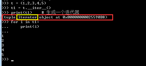 t = (1,2,3,4,5) t1 = t.__iter__() print(t1) # 生成一个迭代器 for i in t1: print(i)