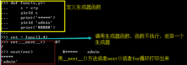 def func(x,y): s = x+y yield s print('*****') yield 'admin' print('#####') ret = func(3,4) ret.__next__() #7 next(ret) #***** admin
