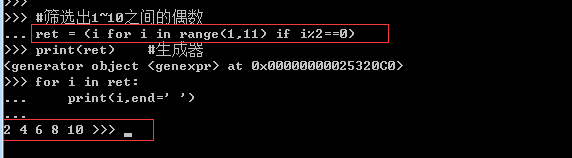 #筛选出1~10之间的偶数 ret = (i for i in range(1,11) if i%2==0) print(ret) #生成器 for i in ret: print(i,end=' ')