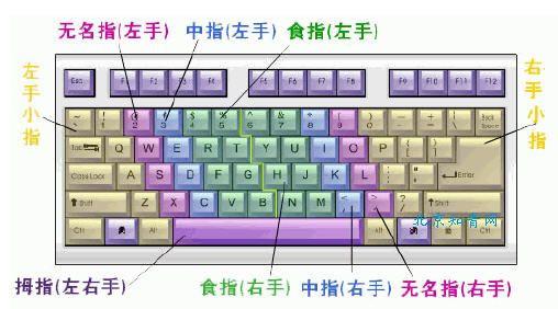 在现实生活中我们经常看见有人用两个或者四个手指用键盘打字,这种方法其实会影响打字效率,也不太容易实现盲打。正确的指位如下图所示: