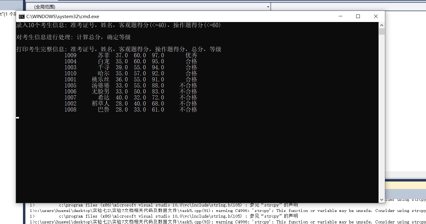 在屏幕上正确输出了按分数由高到底排序的学生信息,同时,在当前路径下,生成了二进制文件file4.dat。用记事本程序打开文件file4.dat,里面的数 据信息直观可读。