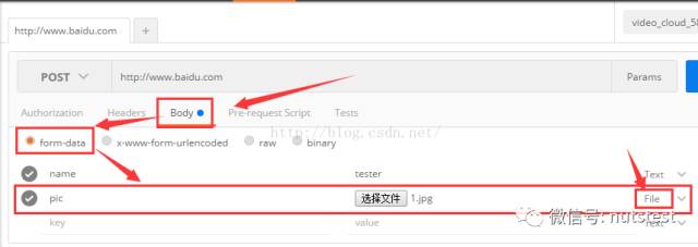 上面的样例是post方式传输普通参数,如果我们需要发送带文件的请求时,就要改下请求格式了,具体如下: