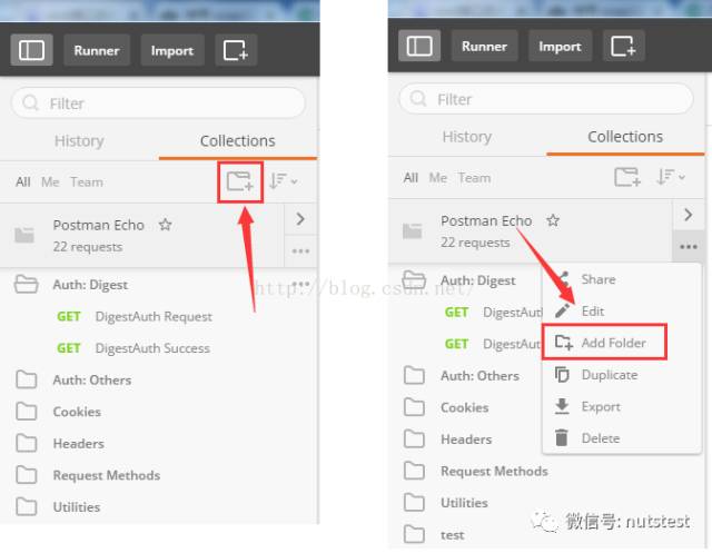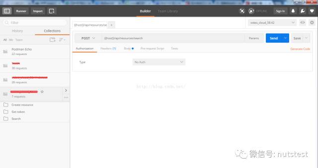 Collections:在Postman中,Collection类似文件夹,可以把同一个项目的请求放在一个Collection里方便管理和分享,Collection里面也可以再建文件夹。如果做API文档的话,可以每个API对应一条请求,如果要把各种输入都测到的话,就需要每条测试一条请求了。这里我新建了一个example用于介绍整个流程,五个API对应五条请求。这个Collection可以通过