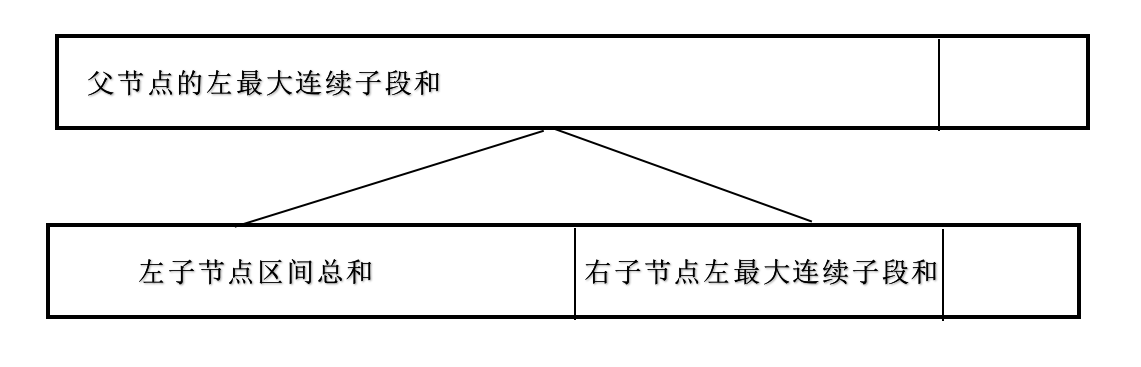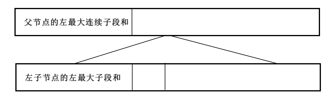 对于这三种情况,在维护时需要比较三者大小来取值。那么这颗线段树此时要维护三个值,最大连续子段和,左最大连续子段和,右最大子段和。接下来看如何维护左右最大连续子段和。对于一个父节点的左最大连续子段和来说,有两种组合情况,如下图:
